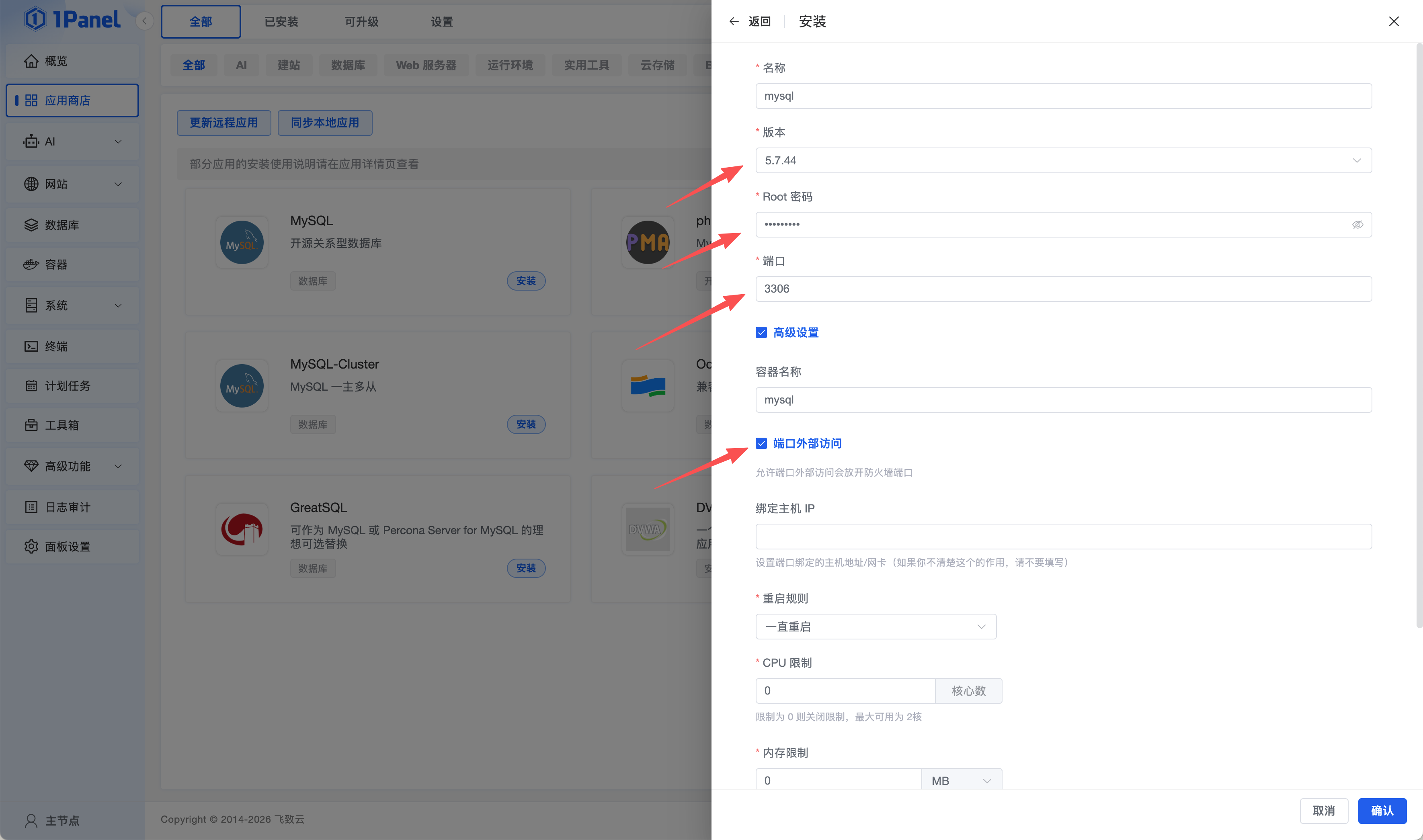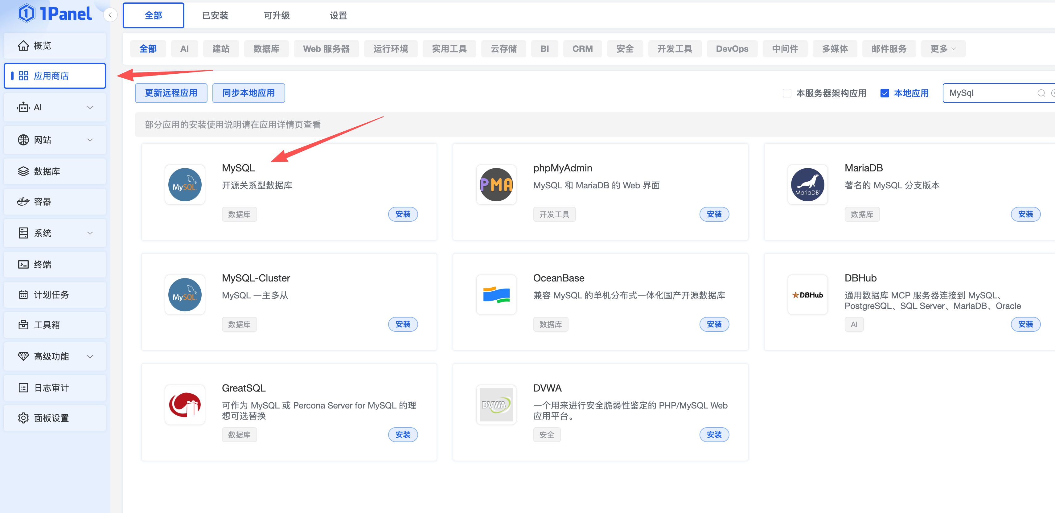 打开 1Panel 应用商店,搜索并找到 MySQL