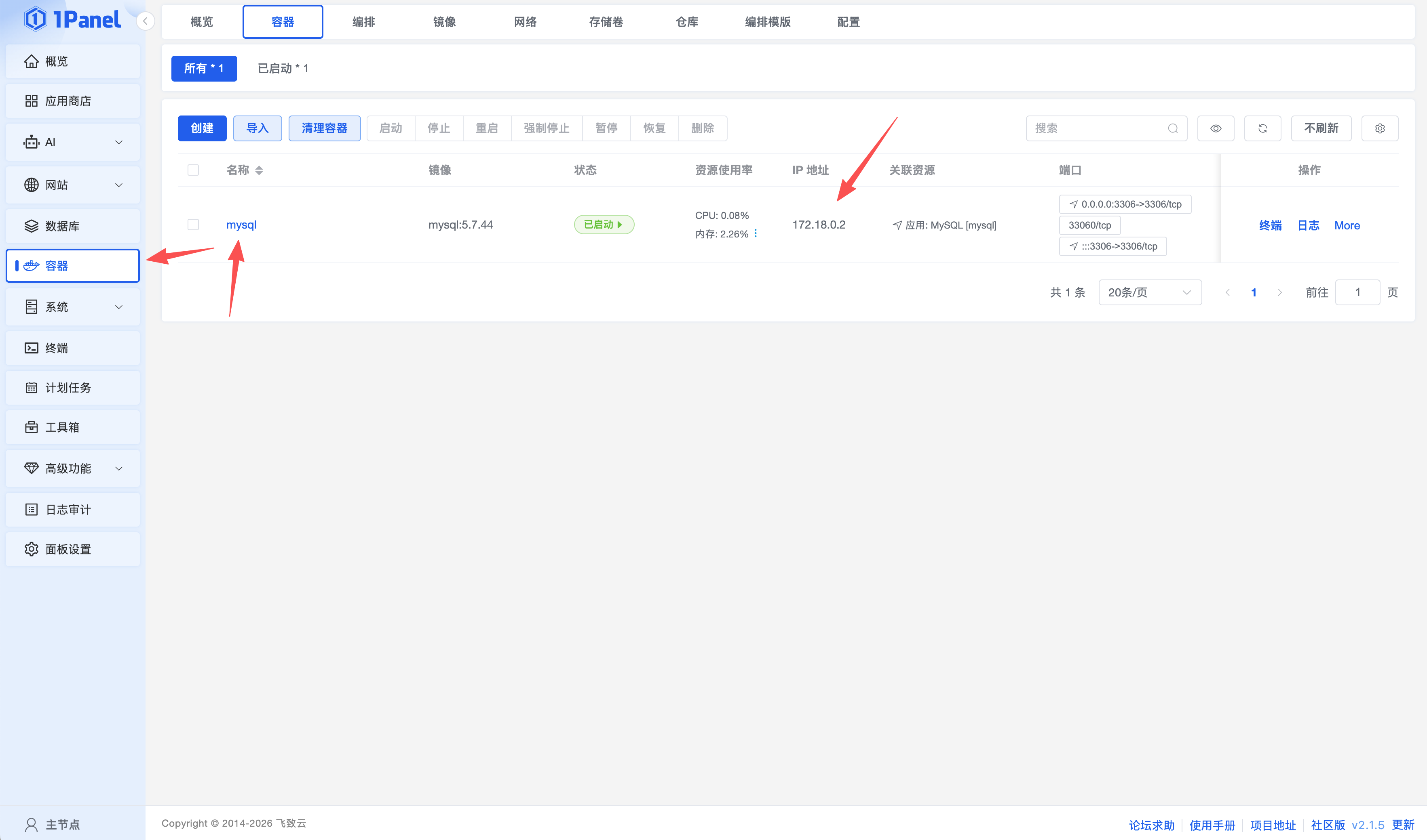 安装完成可在容器菜单看到安装的mysql信息