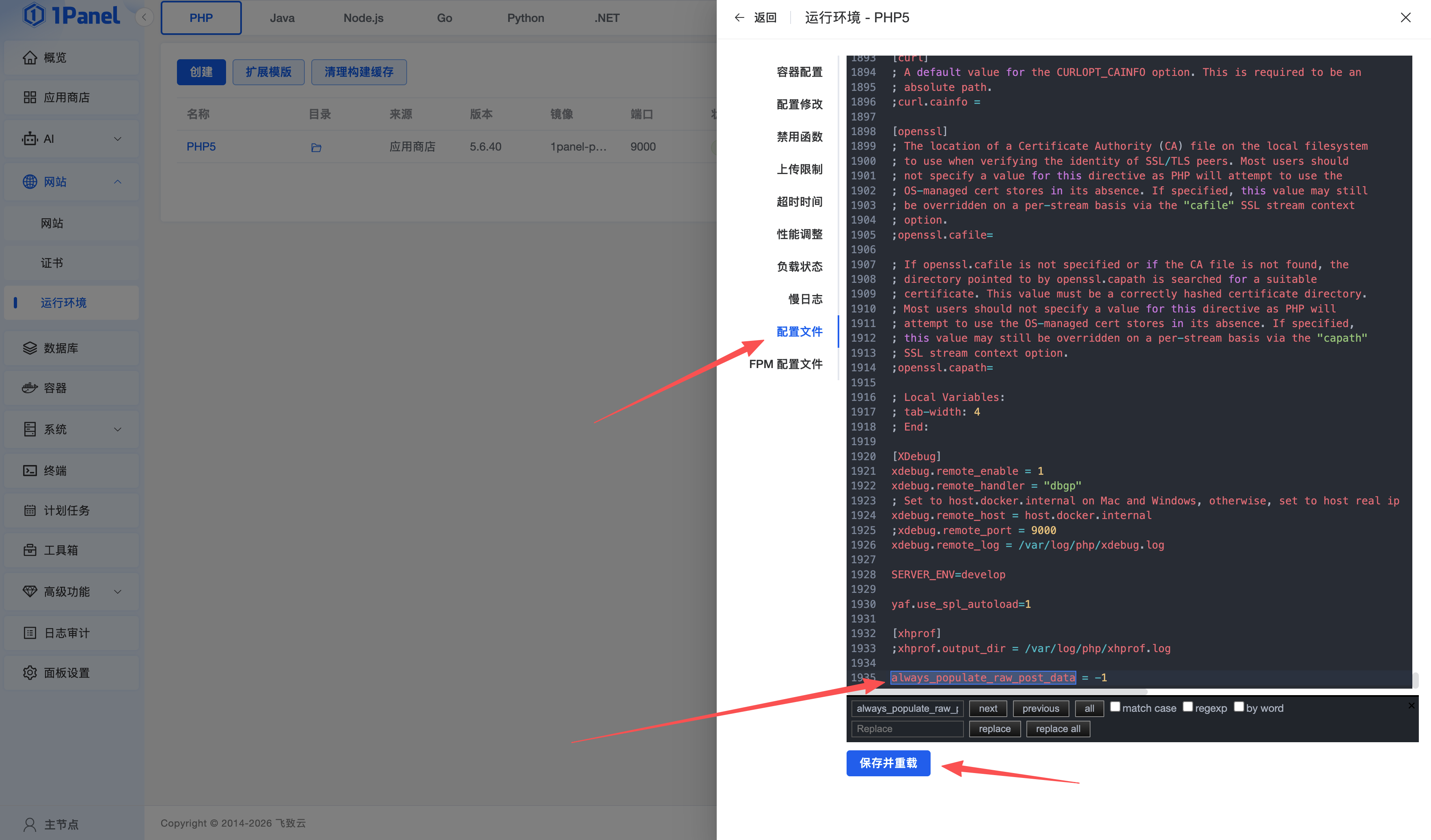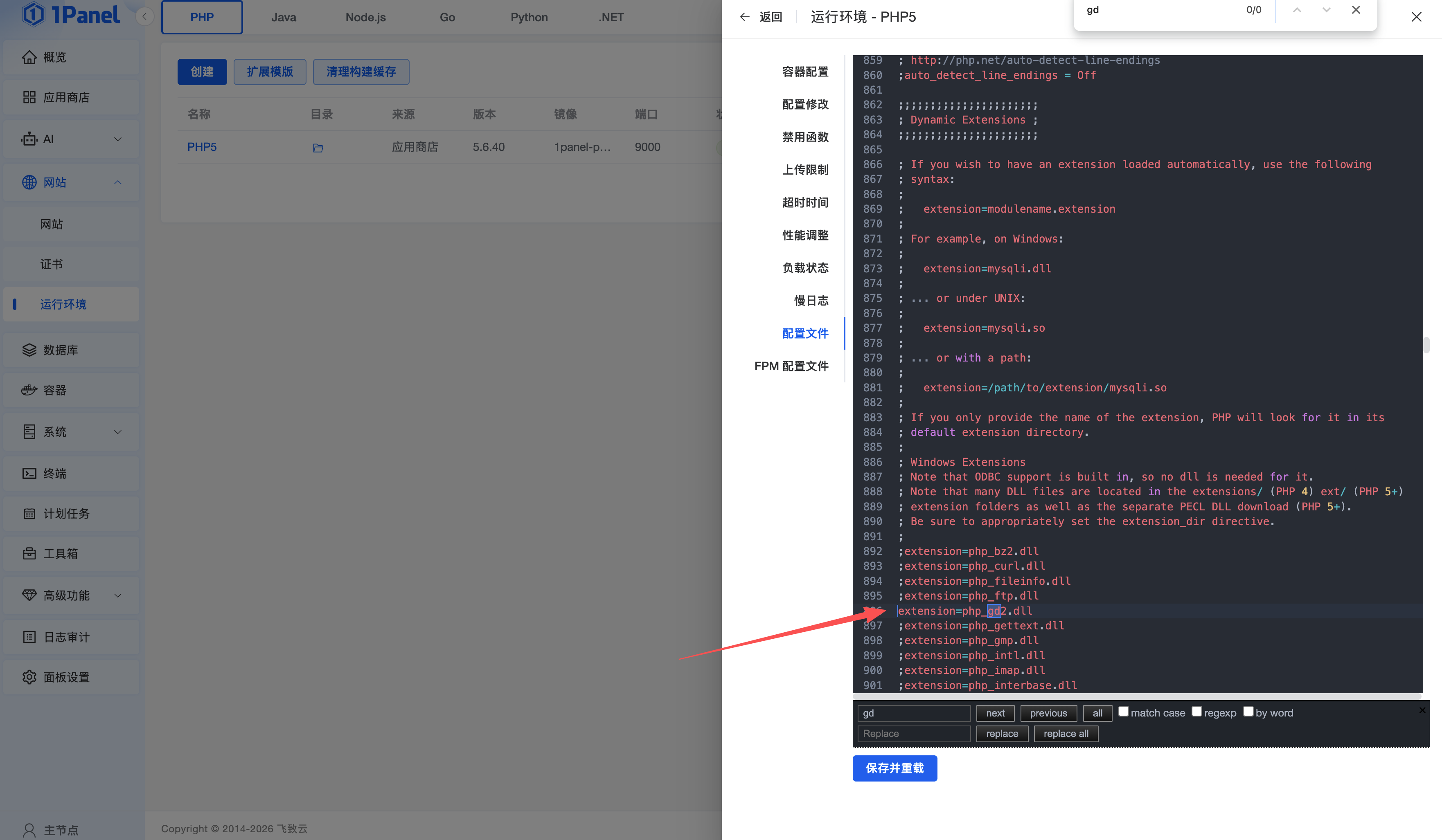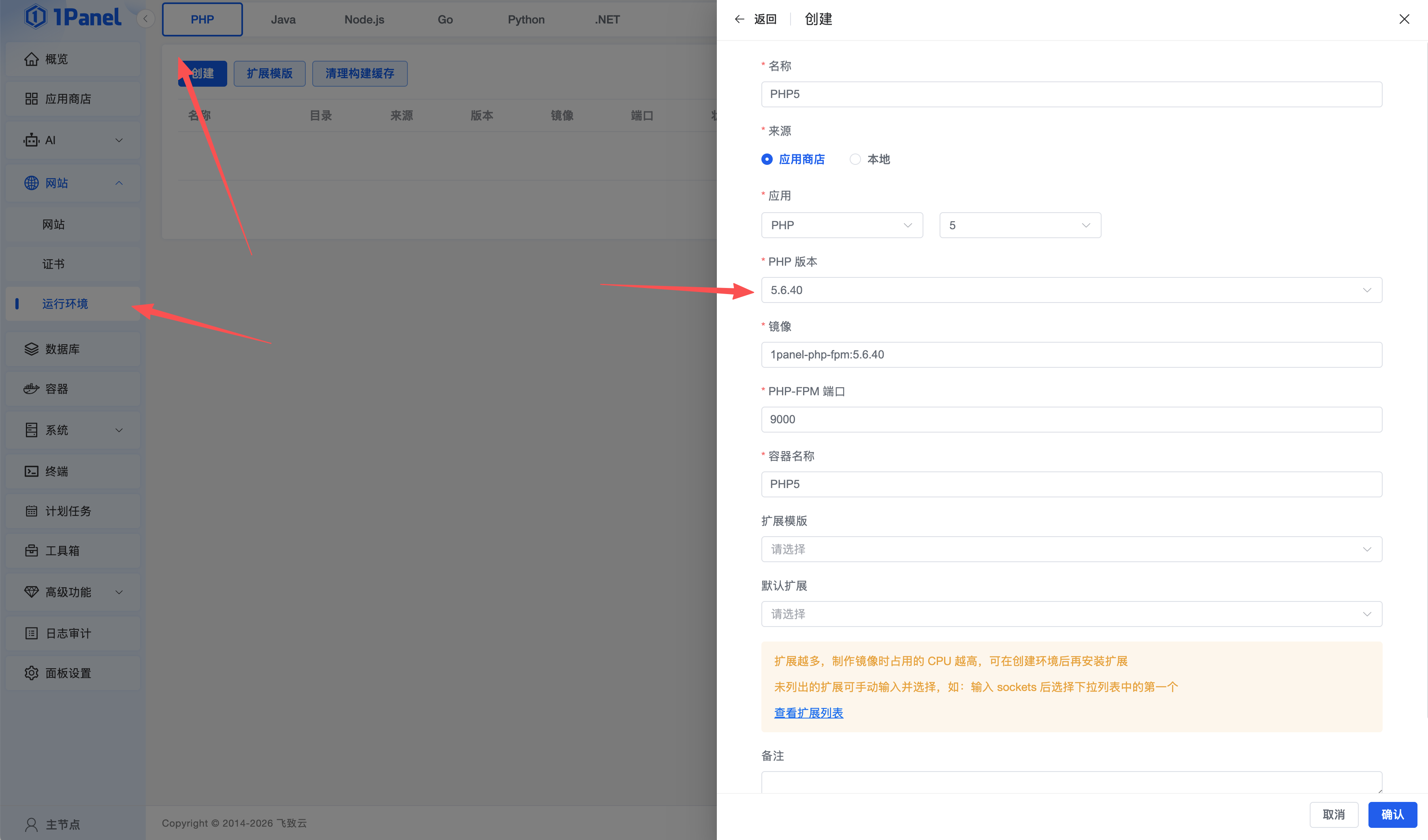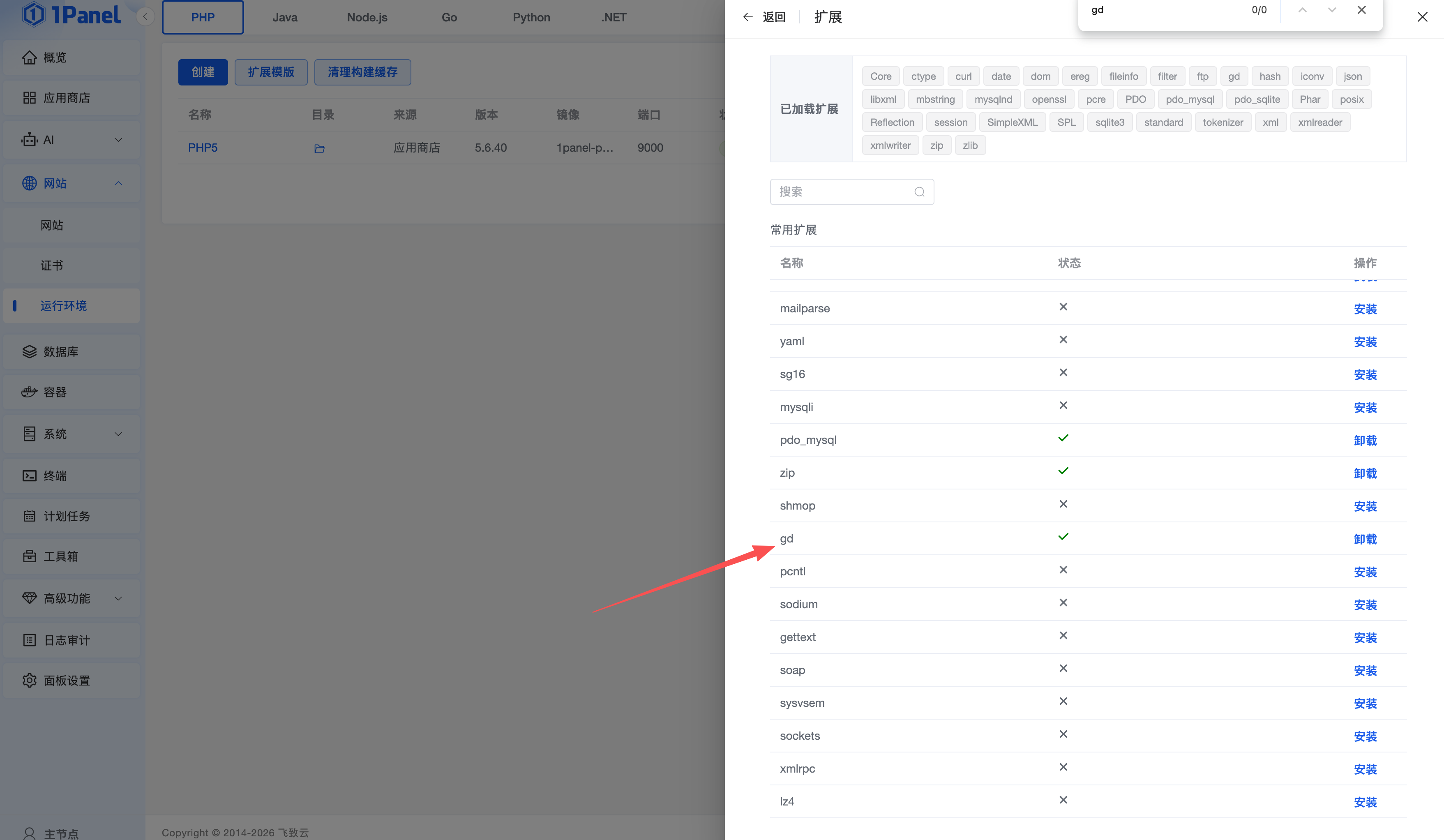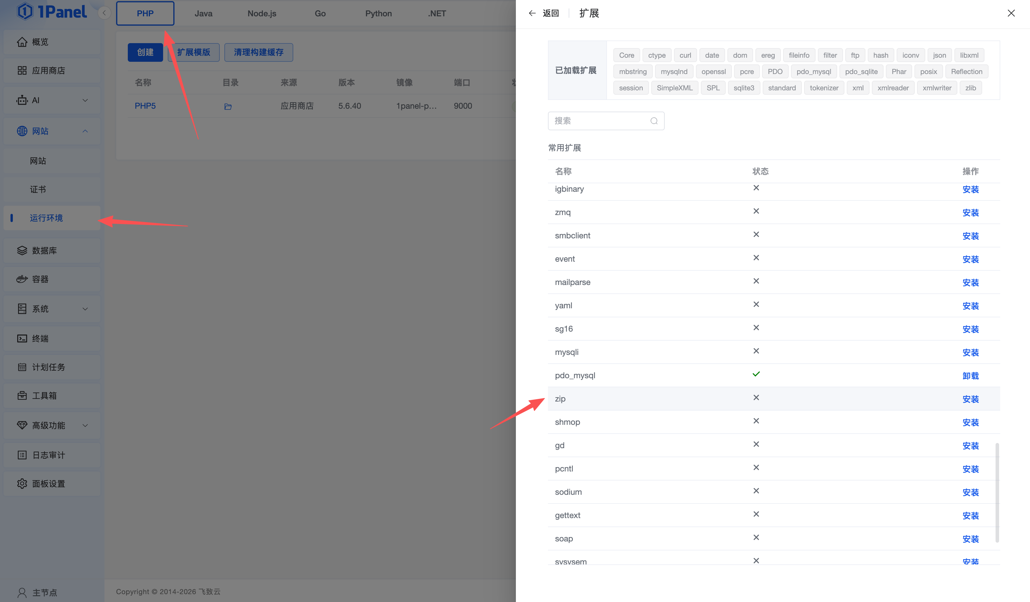 可进入1Panel后台管理页面的运行环境,管理PHP5的扩展插件,安装缺失的扩展插件