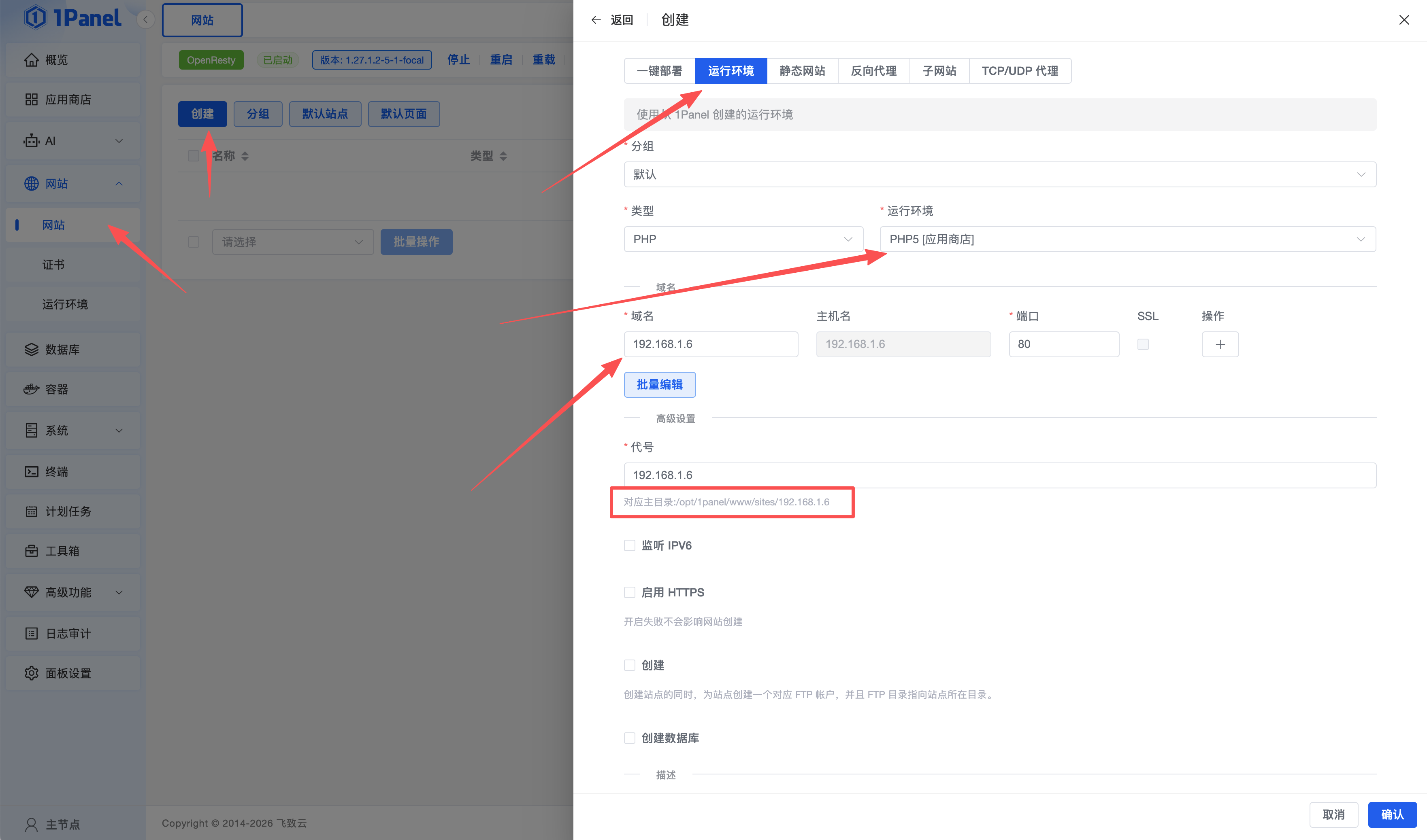 在 网站菜单下找到 运行环境菜单,按下图创建一个PHP5的运行环境