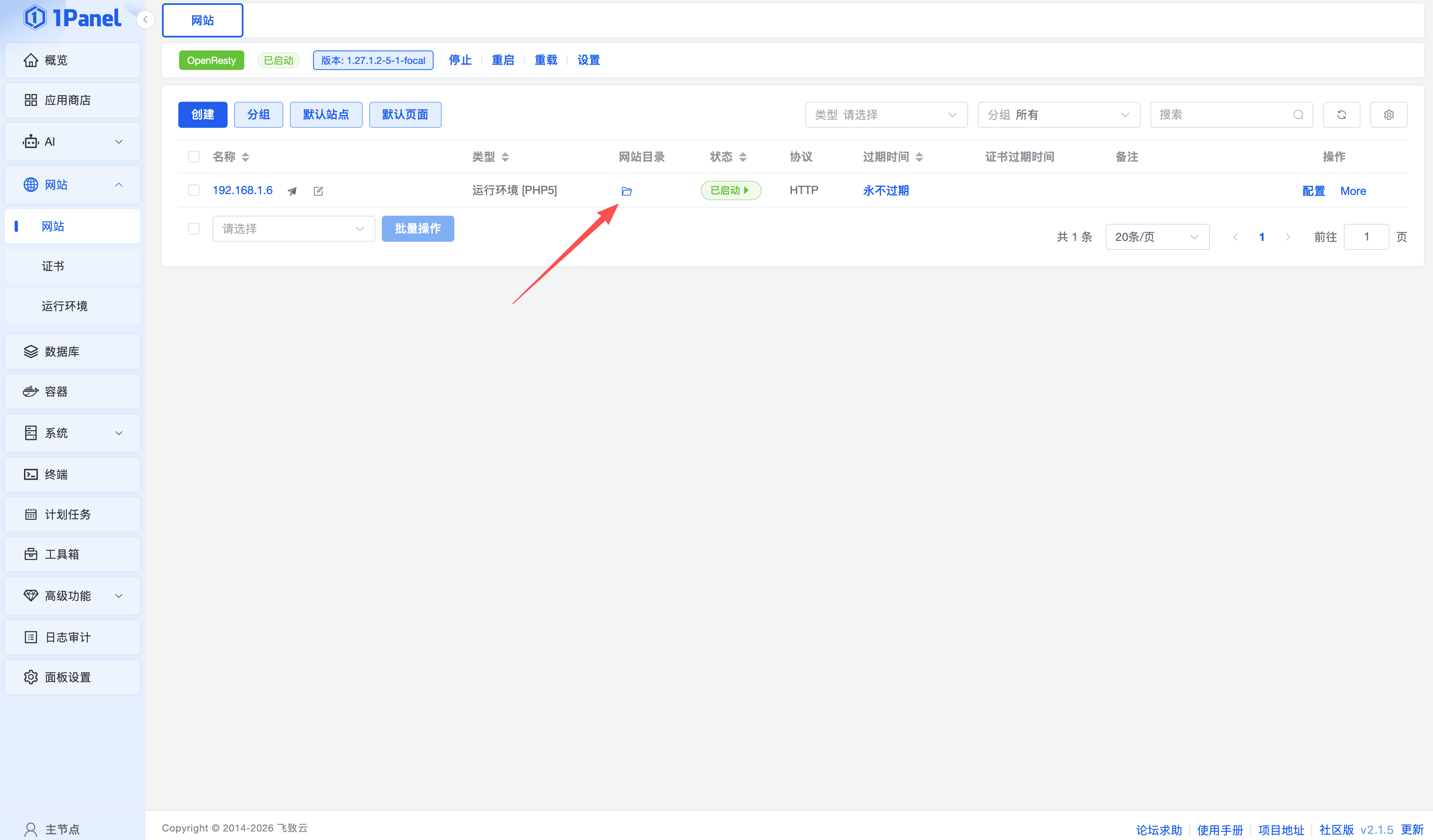 创建完成后,点击网站目录,上传解压后的程序文件到网站目录