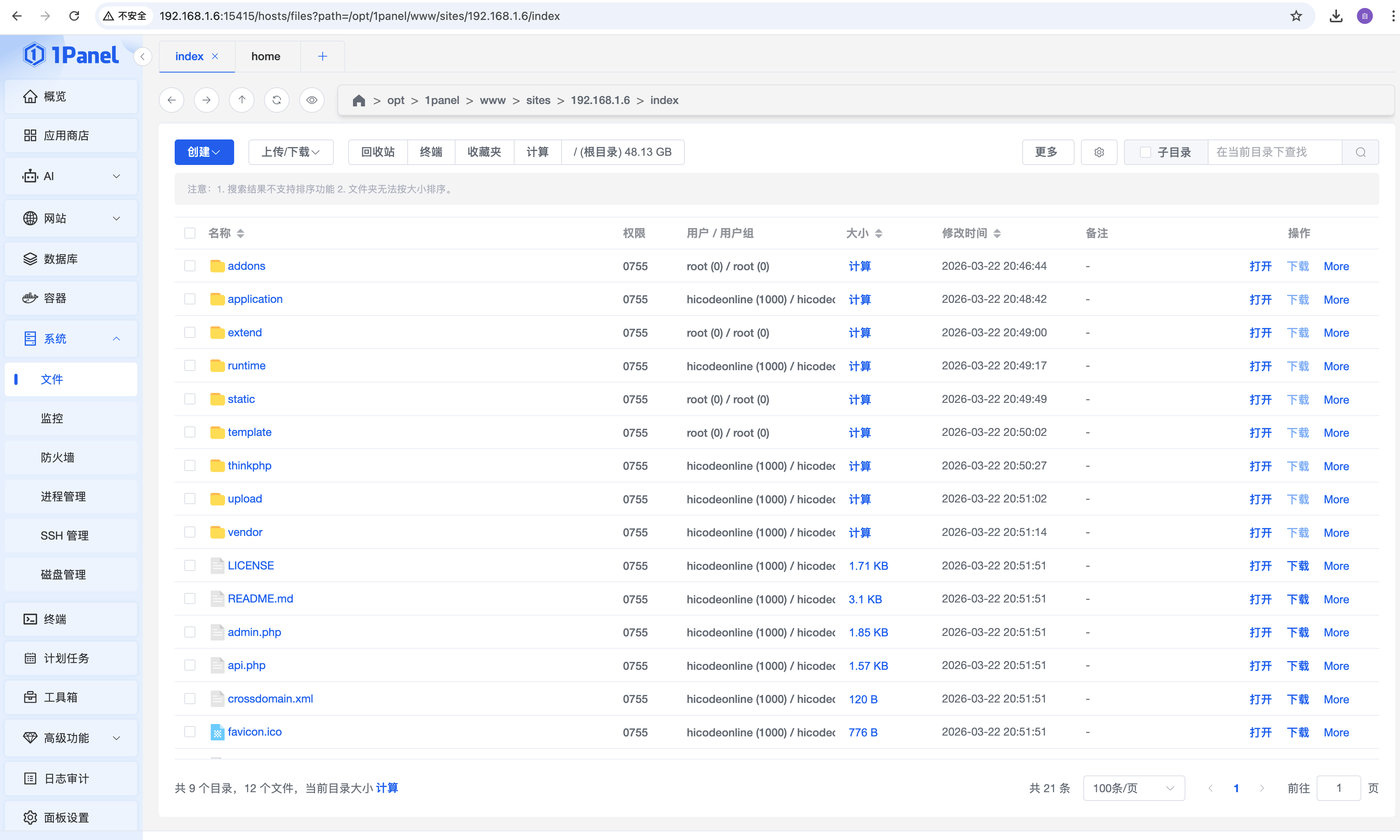 进入网站,点击网站目录进入,找到admin.php,重命名为一个不容易猜到的名称用作后台管理地址,这里重命名为hicodeonline.php