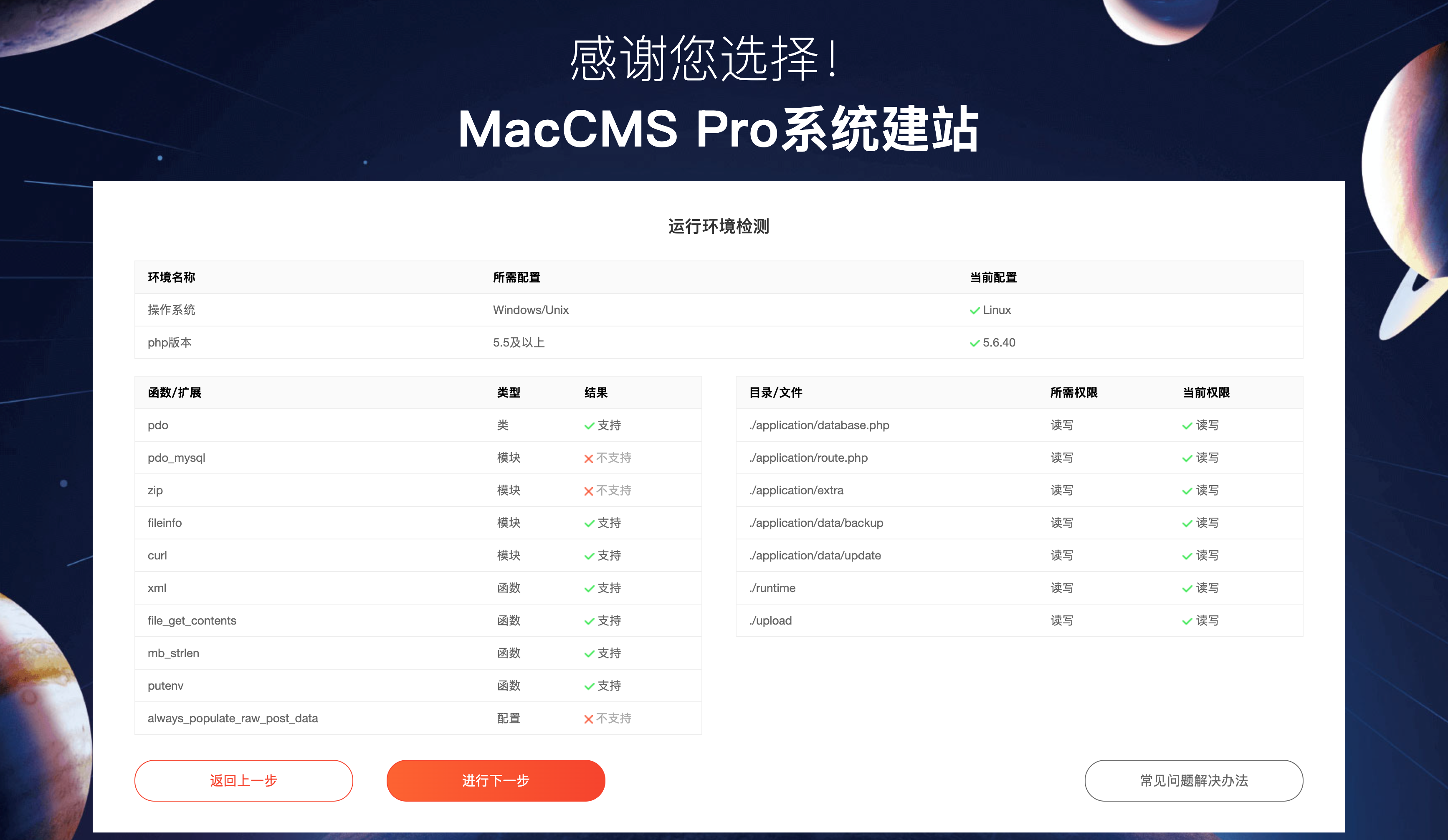 确认后进入下一步环境检测,可查看PHP模块支持情况,如果出现未通过的,如下
