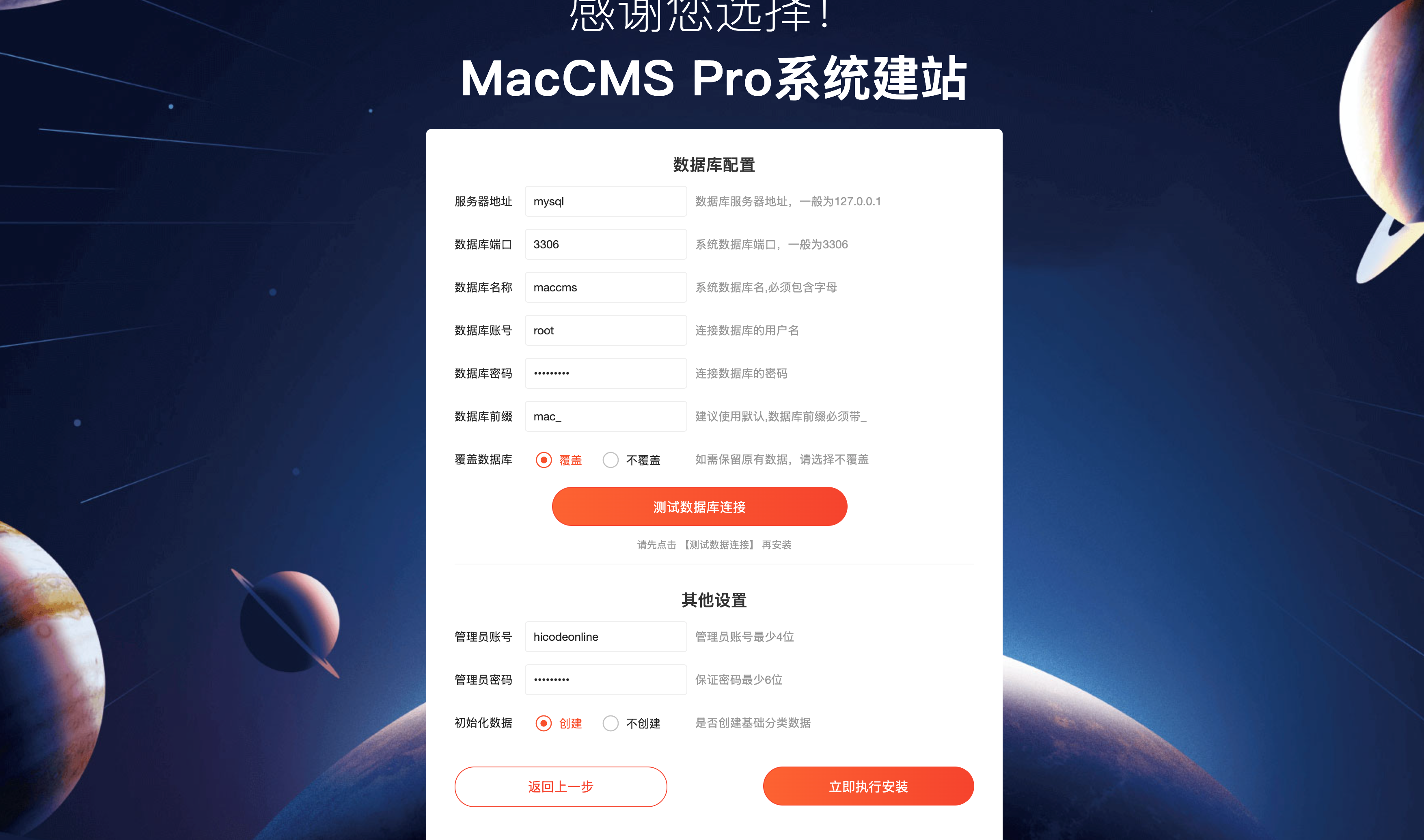 因为使用的docker容器化,所以MySQL的可以填成MySQL容器的容器名称,可以填成MySQL容器的IPv4地址,先点击测试链接是否链接成功,再配置管理员账号信息后,点击立即执行安装