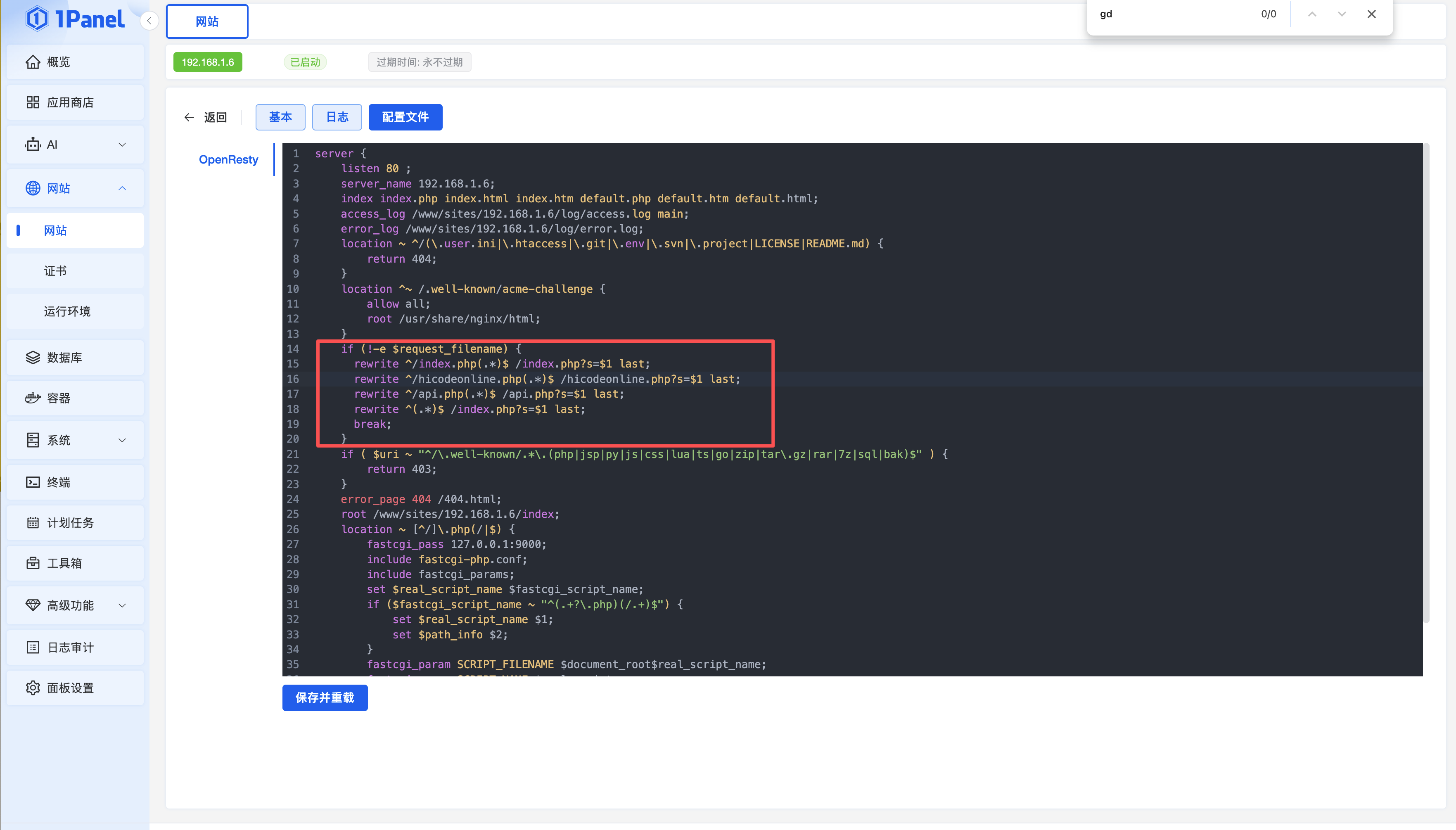 安装好1Panel后,在浏览器打开并登录管理后台