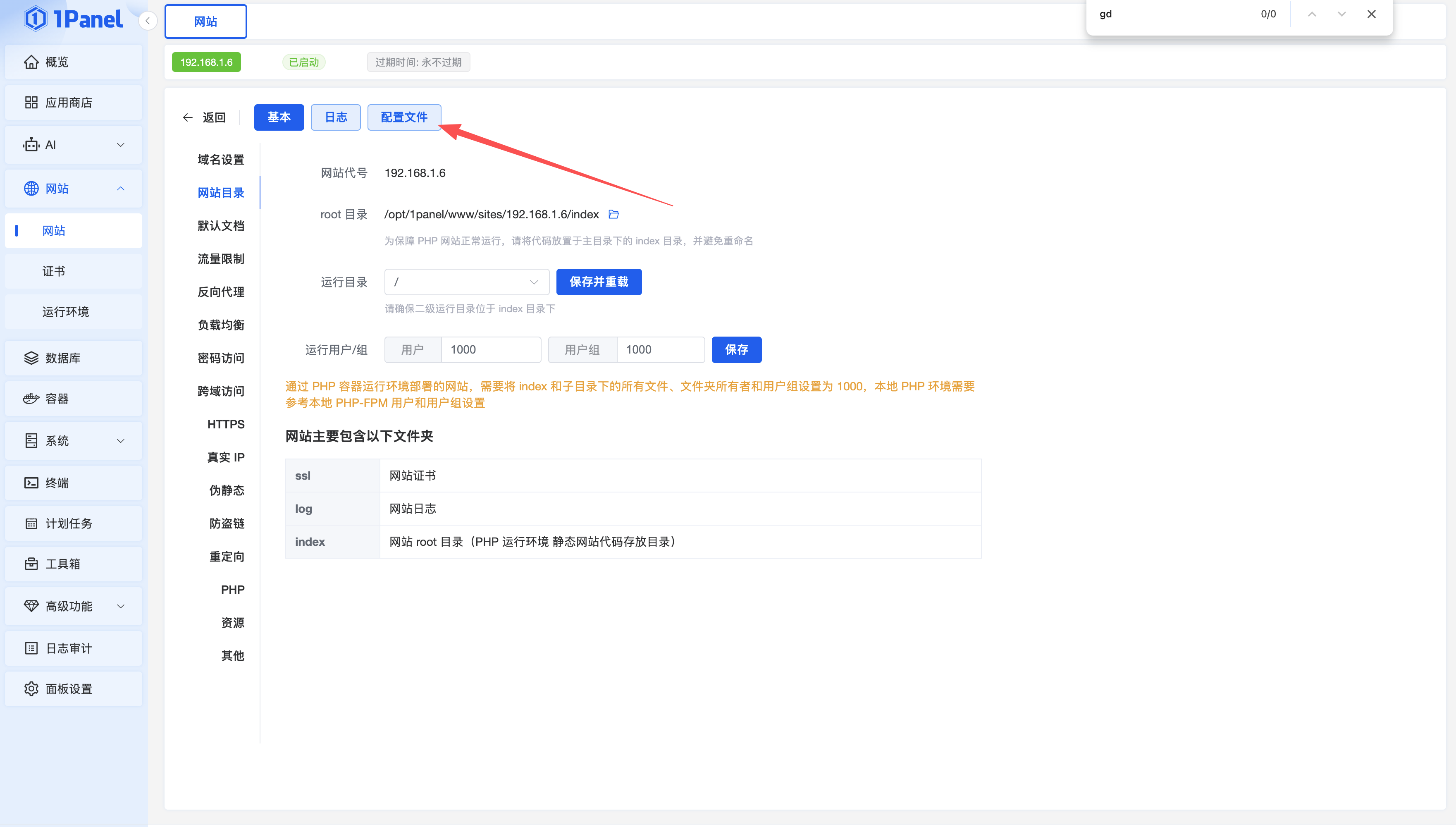 在网站菜单下,打开网站配置文件,增加配置如下