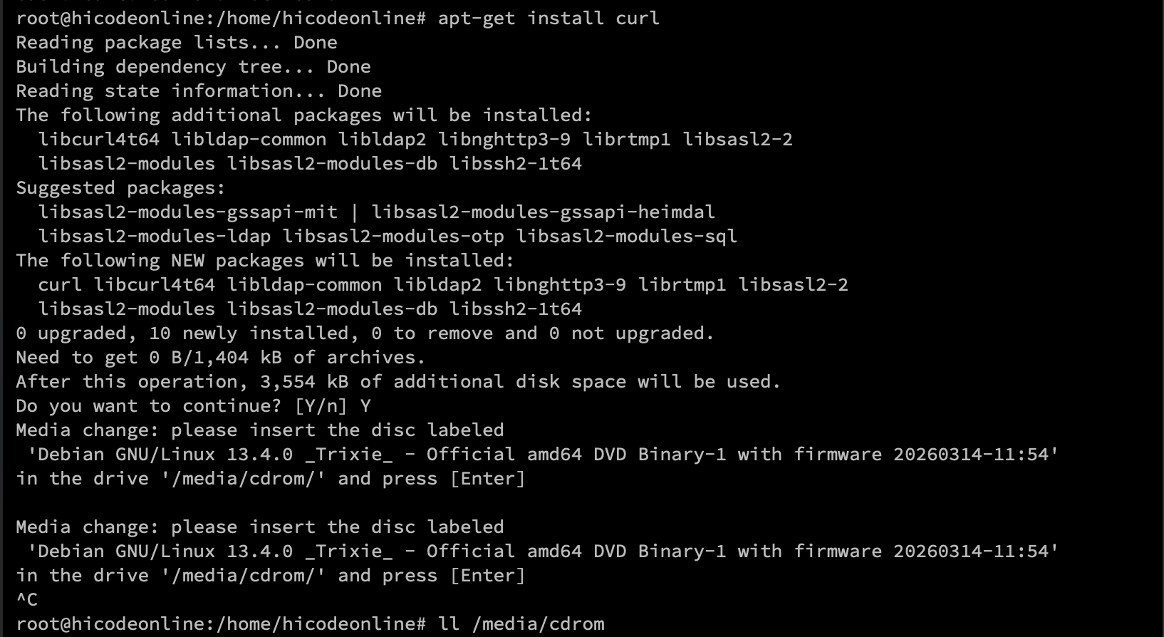 新安装的Debian13安装依赖是出现Media change:please insert the disc labled 'xxxx' in the drive '/media/cdrom/' and press [Enter] 导致安装失败